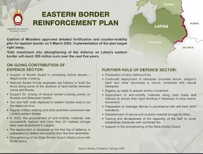 Nel progetto BDL Riga intende investire oltre 300m USD in cinque anni, da utilizzarsi in lavori di anti-mobilità, stoccaggio di materiali, realizzazione di fortificazioni, rafforzamento della Guardia di Frontiera ed acquisizione di mezzi. A ciò si aggiungono regolari esercitazioni di prontezza operativa tra cui, particolarmente importante, la Namejs 2024 che ha coinvolto forze NATO, la difesa civile nazionale e l'intero complesso militare e paramilitare lettone, con focus su mobilitazione, infrastrutture ed operazioni di anti-mobilità ai confini con Russia e Bielorussia.